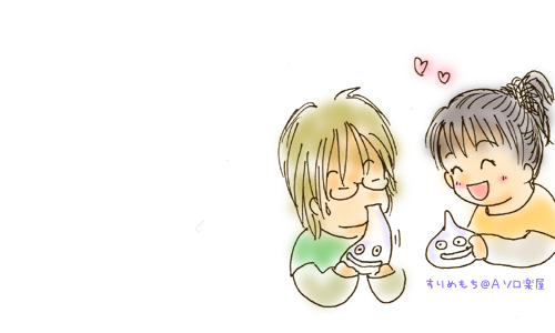 しゅうびさんのCDのジャケットを見ていたら、 「ドラクエ云々」って記述があったので(笑) 伝説の「スライムナイト」発言をしたせんせいとの 合わせネタを描いてみたかったんです。 (シュミ丸出しでごめんなさい) だからって、スライムをもちにして 食わせることはないだろうと言われそうですが… すらいむをモチーフにしたもち。 ってことでvvv(謎笑) とはいえ、えうびちゃん… やたら丸顔になっちゃってゴメンナサイ(汗) 絵が表示されなかった方は、コチラをどうぞv 2007年5月作成 |
