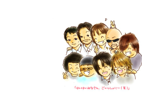 8月25日なんで、とにかく全員描きたかったんです。 並び順は、DOUBLEツアーの位置関係や某会報4月号、さらには 脳内えーえすびーが騒ぐままに決めてみました(最悪)(笑) 元々コレはCASTで公開するために描いてたんです。 でも、いざCASTにアップしてみると コレがやたらちかそうこくさくてですね(笑) 結局、ちかそうこでもこの絵をトップにすることにしました(笑) …しかし…このらくがきが初のC&Aトップって… ちかそうこ、絶対ヘンです(何を今更) 絵が表示されなかった方は、コチラをどうぞv 2007年8月25日作成 |
