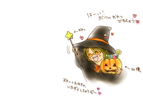 「ボク、おやつほしいです!!!」 って、脳内で誰かが大騒ぎするので描いちゃいました(待て) 気がついたら、コレ。13代目にしてウチのサイト初の ハロウィン絵になってました(笑) なんだかえちかは、今までワタシがサイト上で 行わない行事モノばかりさせてるような気が(汗) (え?何を今更…って?)(笑) ともあれ! ココをご笑覧くださったみなさまにも、 えちかのうきうきの“まほう”が届きますように…vvv 絵が表示されなかった方は、コチラをどうぞv 2007年10月31日作成 |