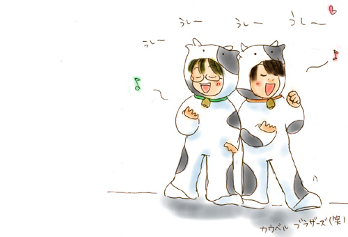 牛の着ぐるみな鍵盤兄弟、その名も カウベルブラザーズです!(どんなだ)(笑) ほんとはコレ、Web用年賀として みなさまに発射しようと思ってたんですが。 例の件(謎)やら、私自体のリアル生活が ほんとにいっぱいいっぱいすぎて… 結局、なにもできずじまいでした(汗) 余談ですが、もちろん「カウベル」は、 例の楽器の名称と、牛の鈴とひっかかってます。 ネタだいすきです(笑) 絵が表示されなかった方は、コチラをどうぞv 2009年1月作成 |